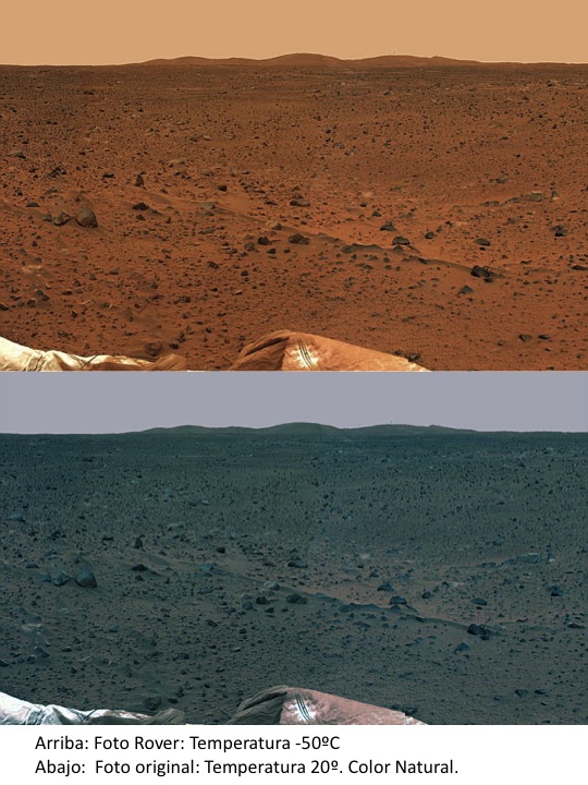 Los metales, colores y contrastes recuperan su color natural. Arriba la foto de la Mars Rover con una temperatura de -50ºC aplicada en filtro de color. Abajo una foto normal a 20ºC de temperatura ambiente. Color natural de los metales.