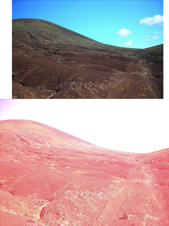 Los tonos “ocres” son cálidos y los azules: “Cielo” fríos. Supongamos que el paisaje marciano es parecido al de Rio Tiento, tal y como aseguran muchos expertos de la NASA. Basta con cambiar la temperatura del color para tener el efecto de la imagen superior. “Arriba reflejamos un efecto de color de -60 Grados centígrados” . En la imagen inferior la temperatura real “20ºC”.