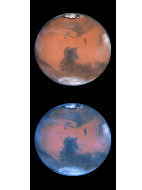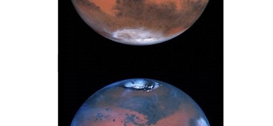 Curioso veamos lo que sucede con la imagen superior de Marte cuando invertimos las temperaturas para encontrar el color «real» de la toma: