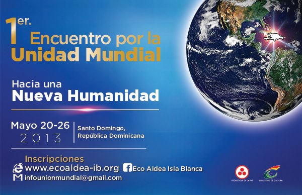 encuentromundialLa celebración del Primer Encuentro por la Unidad Mundial, hacia una NUEVA HUMANIDAD , tendrá lugar desde el 20 al 26 de Mayo, 2013, en La Biblioteca Nacional PHU localizada en la Plaza de la Cultura en la ciudad de Santo Domingo y la Eco Aldea Isla Blanca en los Cacaos, San Cristobal.
