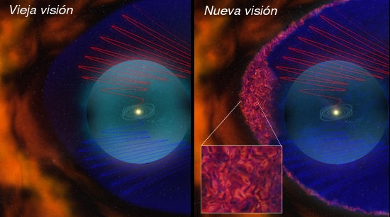 «El campo magnético del Sol se extiende hasta los límites del sistema solar», explica Opher. «Debido a que el Sol gira sobre su propio eje, el campo magnético se enrolla y se pliega, como si fuera la falda de una bailarina. Muy lejos del Sol, donde las naves Voyager se encuentran ahora, los pliegues de la falda se aplastan unos contra otros».