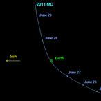 Un asteroide del tamaño de dos autobuses ha pasado hoy muy cerca de la Tierra, a unos 12.300 kilómetros de distancia, y ha dejado en el firmamento un rastro parecido al de una estrella fugaz. Astrónomos han conseguido captar el paso de la roca espacial, conocida como 2011 MD, imágenes y animaciones que pueden contemplarse en distintas webs especializadas. Como estaba previsto, el NEO (de objeto cercano a la Tierra, en inglés) ha cambiado drásticamente su órbita por el efecto de la gravedad de nuestro planeta, pero, al parecer, ni ha entrado en la atmósfera ni, como es lógico, ha causado daño alguno.