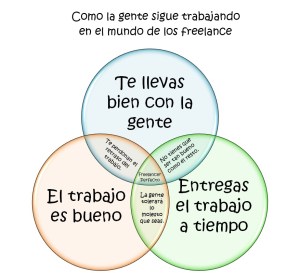 La gente sigue trabajando en el mundo del trabajo independiente, y más y más del mundo de hoy es independiente, porque su trabajo es bueno, y porque son gente de trato agradable, y porque entregan su trabajo a tiempo. Y ni siquiera necesitas las tres. Dos de tres está bien. La gente tolerará lo desagradable que puedas ser si tu trabajo es bueno y lo entregas a tiempo. Ellos perdonarán tu tardanza si el trabajo es bueno, y les caes bien. Y no tienes que ser tan bueno como los otros si entregas las cosas a tiempo y siempre es un placer saber de ti.