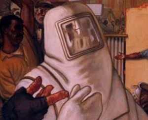 A la izquierda de la pintura hay una persona que lleva un traje de riesgo biológico, haciendo alusión a una especie de guerra química.